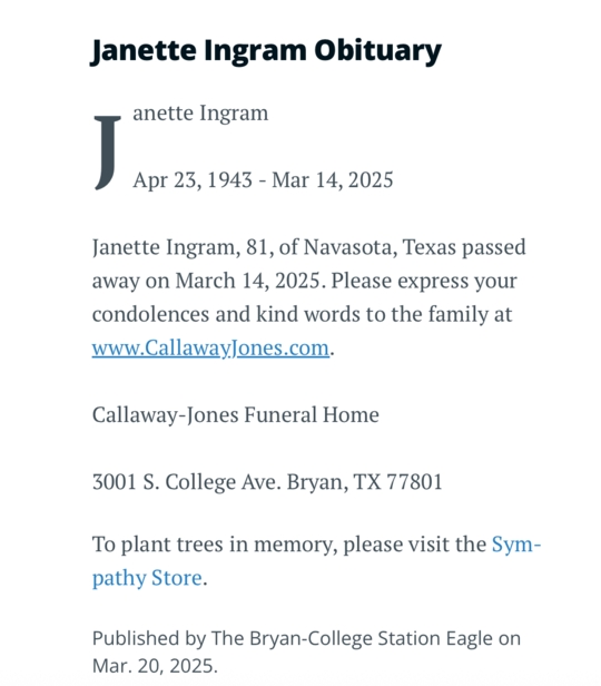 Janette Bewley Ingram, Navasota, TX, passed away on March 14. Arrangements are pending at Callaway-Jones Funeral Home. I will post an obituary when it becomes available.